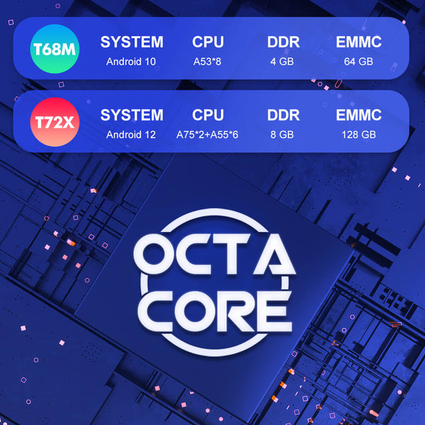 1.T72X CPU A75*2+A55*6 RAM 8GB ROM 128GB , and T68M Android 10 CPU A53*8 RAM 4GB ROM 64GB ;