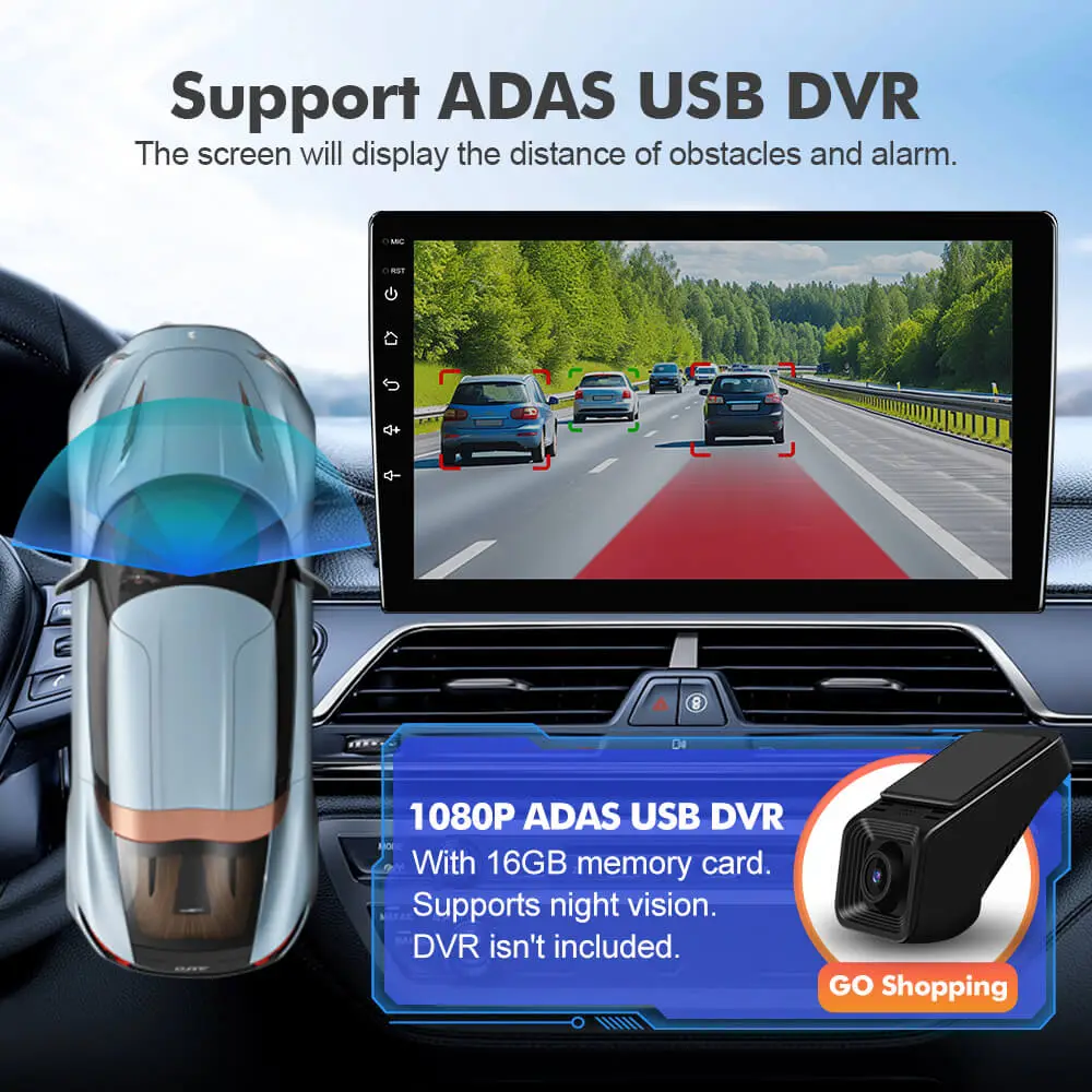 Support ADAS USB DVR input, the screen will display the distance of obstacles and alarm.