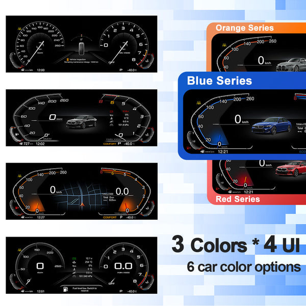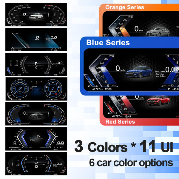Customizable 3D Animated UI Options Basic Version features 4 UI themes, while the Upgraded Version offers 11 UI themes. You can choose from 3 color options, along with 7 car color options: black, white, blue, red, gray, brown, or cyan. Please note that some colors may vary depending on the model.
