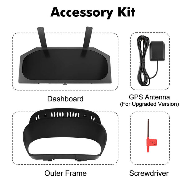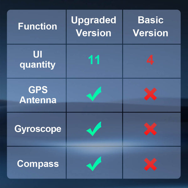 Upgraded Version vs. Basic Version Both versions have the same overall features. The main difference is that the basic version does not come with a GPS antenna and lacks support for GPS timing, compass, G-force, and gyroscope. Features like HUD, CarPlay, Android Auto, car info, fuel info, vehicle diagnostics, tire pressure display, steering wheel control, door status, and 3D animation ect.. are the same in both versions.