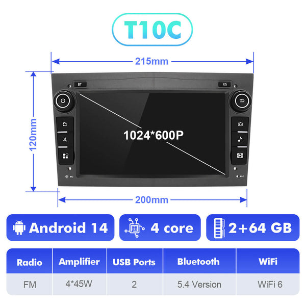 T10C = 2GB RAM + 64GB ROM, CPU: 4x Cortex™-A53 @ 1.45GHz, RAM + ROM: 2GB + 64GB, Radio Chip: 8035-FM, Amplifier Chip: YD7388 4x45W