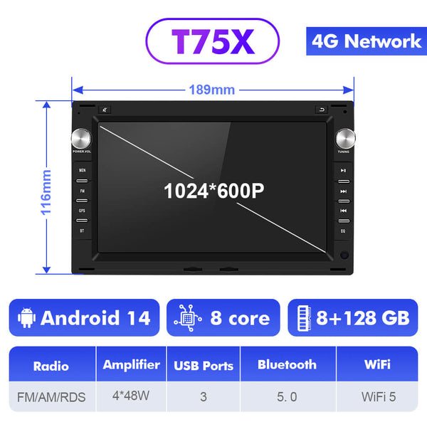 T75X = 8GB RAM + 128GB ROM, CPU: 2x A75 @ 2.2GHz + 6x A55 @ 1.8GHz, RAM + ROM: 8GB + 128GB, Radio Chip: TDA7708, FM/AM/RDS , Amplifier Chip: TDA7851 4x48W