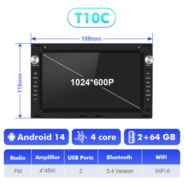 T10C = 2GB RAM + 64GB ROM, CPU: 4x Cortex™-A53 @ 1.45GHz, RAM + ROM: 2GB + 64GB, Radio Chip: 8035-FM, Amplifier Chip: YD7388 4x45W