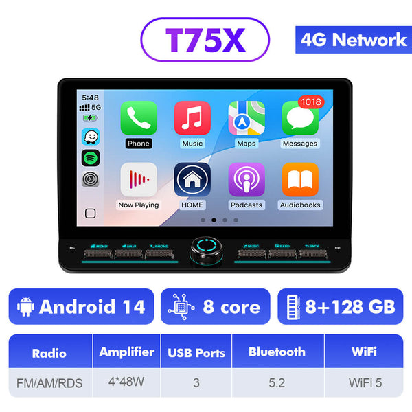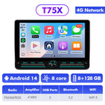 T75X = 8GB RAM + 128GB ROM,  CPU: 2x A75 @ 2.2GHz + 6x A55 @ 1.8GHz, RAM + ROM: 8GB + 128GB, Radio Chip: TDA7708, FM/AM/RDS , Amplifier Chip: TDA7851 4x48W